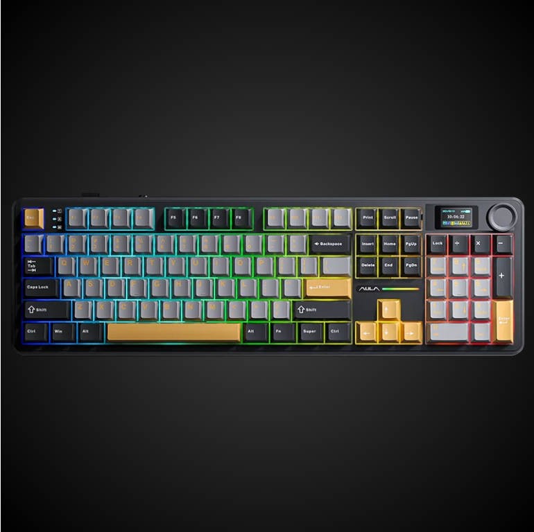 连接方式: 支持有线(Type-C)、蓝牙和2.4G无线三模连接,方便在不同设备间切换使用。键盘配列: 采用标准的108键全尺寸布局,保留了功能键和数字区,使用便捷。轴体: 支持全键热插拔,并提供多种轴体选项,如焦糖拿铁轴、听雨轴和风灵轴等,以满足不同用户对手感和声音的需求。多媒体功能: 键盘右上角配备了多媒体旋钮和智能显示屏,可以进行音量控制和自定义功能设置。设计: 采用Gasket结构,并配有5重满配声音包,提供出色的敲击手感和声音体